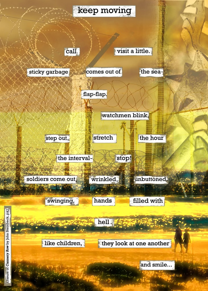 Author Note: The hybrid work is from a W.I.P. entitled: ‘Little Fish, Uncanned’ which is a hybrid art-poetry manuscript created from ‘Cannery Row,‘ by John Steinbeck. Each poem is an erasure of one single page of this brilliant novel, and each poem is placed on a background of my original art, whether digital photo-art or some other art medium.