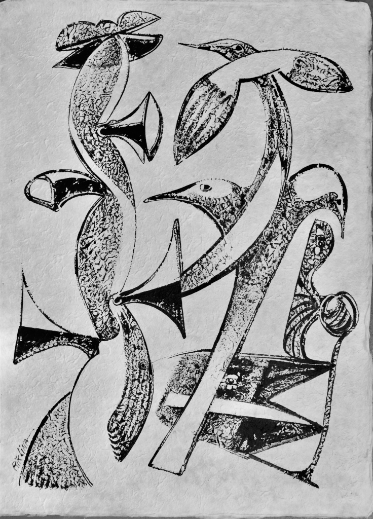 Surrealists have always engaged in collaborative creation, in all manner of ways. In 1919 André Breton and Philippe Soupault created the first surrealist text, Les Champs magnétiques in collaboration. The Magnetic Fields is considered the inaugural application of automatic writing, exemplifying the sustained flowing of poetry-artmaking into life, and vice versa. Rik Lina and I first met in person at O reverso de olhar (The Inverted Gaze), an international surrealist exhibition organized by Miguel de Carvalho in Coimbra, Portugal in 2008. International gatherings of this kind afford surrealists the opportunity to engage with each other through collective artmaking and writing, readings, and inventing and playing games, such as the by now familiar, even trite, cadavre exquis. It was there that I first shared my writing of what became Enter the Raccoon, prompting Rik and Miguel that I write texts to Rik’s work. Rik Lina’s experience in working collaboratively with artists in automatist groups he’s lead, like CAPA, are legendary, so I welcomed the suggestion with enthusiasm and gratitude. Rik chose as the source material a large selection of black & white automatic drawings he titled The Secret Life of Plants, which he’d created during his time in the Dutch Antilles, a defining period in his trajectory. I very naturally began “riffing” off his automatic drawings. Something in the rhythm of Rik’s brushstrokes, the forms imprinted in him by what he saw, heard, and touched as a sea diver in Bonaire, and recorder of the jungles of nearby Saba, evoked in me characters moving in a parallel world. There is something incredibly liberating in Rik Lina’s work, which I identified with a life I would have wanted to live, specifically among the inhabitants of a house on Rue du Chateau in Paris, where many surrealists lived during the late 1920s and early 1930s. That is why The Secret Life of Plants can also be read as The House on Rue du Chateau, the title of a work in sixteen chapters from which these three collaborations are selected.