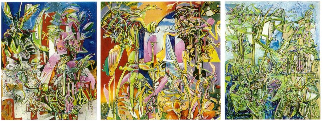 Born in The Netherlands in 1942, Rik Lina has lived and worked in several continents, shaping his life after Odilon Redon’s dictum, “Immerse yourself in nature!”, dedicating his art to the study of deserts, mountains, tropical rainforests, and coral reef jungles. His 1975 emigration to the Caribbean Island of Bonaire, coupled with the thousands of hours he logged in scuba diving and installing the Marine Parks there, in the island of Saba, and the Take Bonerate Archipelago in the Timor Sea, became the defining experience. His entire oeuvre expresses the poetry of pelagic realms, jungle life, and cloud forests, always in constant echo of his inner life. Rik Lina studied at the Rietveld Academy of Amsterdam (1961-1966). His work has been featured in countless solo and collective international exhibitions, including 80 in the context of surrealism. In 1968 he joined the BRUMMES BLONDES group and the PHASES movement. He is one of the founders of three international collective painting initiatives CAPA (Collective Automatic Painting Amsterdam, since 1991), the CABO MONDEGO SECTION of Portuguese Surrealism (since 2008) and CORNUCOPIA (since 2010). Rik Lina founded the anarchist/surrealist magazine DROOMSCHAAR (1990-1994) and has participated in the publications of contemporary surrealism, including Brumes Blondes, Phases, Ellebore, Debout sur L’Oeuf, A Phala, Punto Seguido, Derrame, Hydrolith, Salamandra, Alcheringa, Vocative, to name a few.