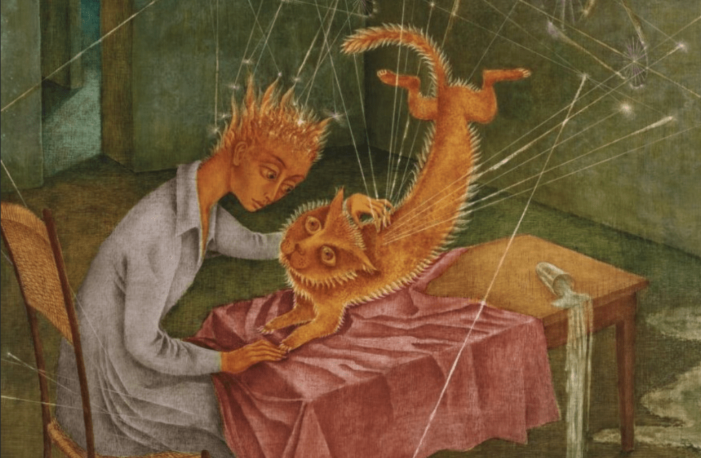 For years I’ve been receiving lines of poetry in my dreams. I finally started keeping an open notebook on my bedside table to keep track of these dream lines. During my writing practice, I began working them into my poems. One such line became the title of my ninth book, Put Flowers Around Us and Pretend We’re Dead. While reading Art of the Occult by S. Elizabeth, I was stopped in my tracks by the image “Witch Going to the Sabbath.” Who had created this painting of a redheaded woman holding her familiar, an exotic cat? Her name: Remedios Varo, a Spanish artist who moved to Paris in 1937 to be with the Surrealist community. A few years later, during the German occupation in France, she escaped to live in Mexico City, where she died in 1963. A chance encounter led me to her marvelous. Enchanted, drawn in, I was pulled by her invisible string. That initial spark grew into poem after poem. Lines of poetry that appeared in my dreams intertwined with research on her life and art, her drawings and writings. It all intersected in a creative vortex where, as Remedios believed, the dream world and the real world are the same. Through entanglements with the uncanny, the poems explore the “invisible thread that unites all things.” A collaboration with the otherworldly through the alchemy of image and word, sound and sense, guided me to write these poems. Remedios permitted me to dive deeper into the hidden. My literary imagination was fueled by her visual expressions. With her as my guide we metamorphosed the mystic.