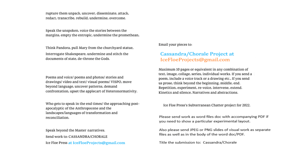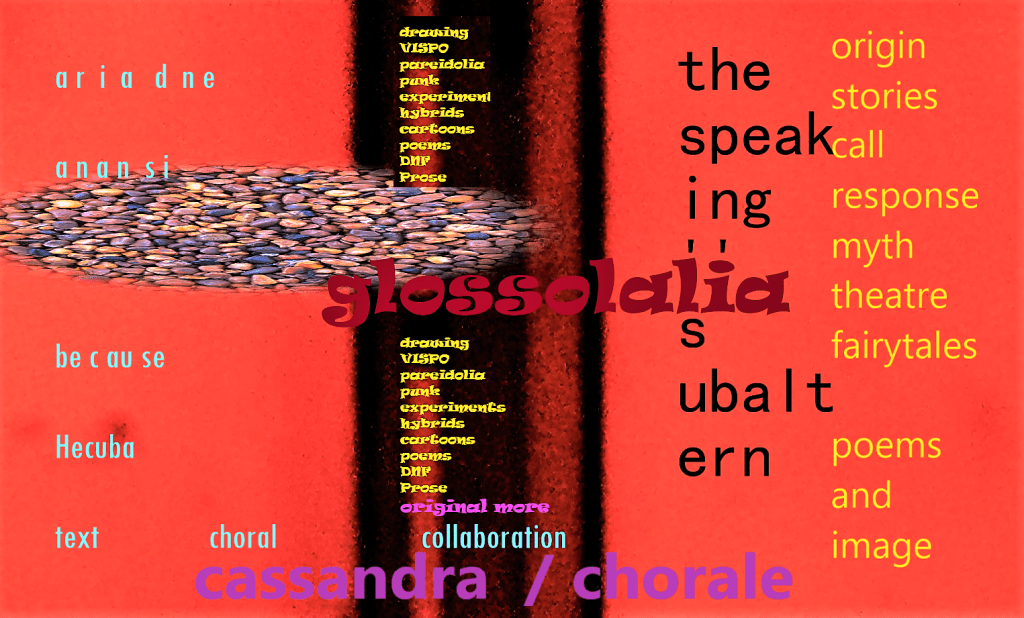 CASSANDRA / CHORALE STORIES VOICE IMAGES MYTHS PAREIDOLIA LIMINAL FAIRY TALES ORIGIN STORIES THE CANON CARTOONS VISPO POEMS HYBRIDS PROSE DRAWINGS EXPERIMENTS CONCRETE CNF VIDEO
