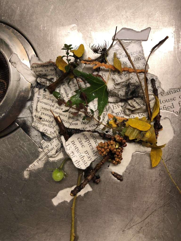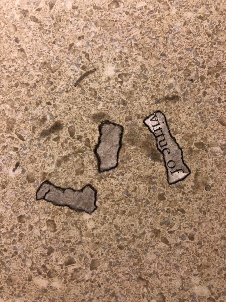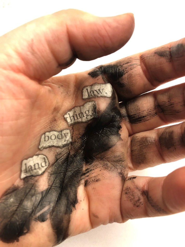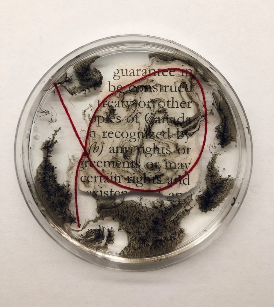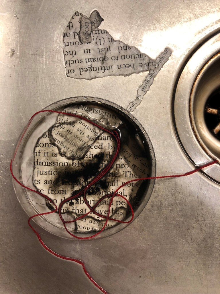I’m currently experimenting with a project I’m calling conjure, which features work created in petri dishes with water, ink, fragments from the Canadian Charter of Rights and Freedoms, and various found objects. After each instance, I dump the contents of the petri dish into my sink and try something new. This series shows a finished piece from that project, as well as snaps of my work in progress. This work of experimenting with my hands, of indulging in hand to object care and contact, is the way by which I process and work through the complexities of our world and my being in it. Here is the work of that work, the muck of these conjurations, the failures, the tries again, everything and the kitchen sink.