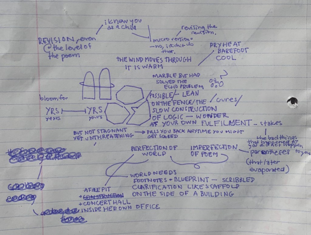 [accessibility text: i will begin with a line in the middle of the page, because it is the first one i wrote: “marble but had solved the echo problem,” which is connected by a straight line to “dry heat barefoot cool.” just above are the unconnected words “the wind moves through it is warm.” moving down the page, the next words say “possible” in between slashes to denote italics, then “lean on the fence / the slow construction of logic — wonder at your own fulfilment – stakes — the bad things that happened to you did not happen to you.” further down is “but not stagnant, yet unthreatening,” then a horizontal arrow to the line “pulls you back anytime you might get scared.” to the left of these sentences, and below the hill-like shapes, reads, “bloom for yrs (years) yrs (years).” yrs is a shorthand stevie howell uses in the poem and throughout her book to mean both of these words. they are connected here by a line that looks like a spectrum. below these words reads the phrase “perfection of world,” which draws a straight line to “a fire pit,” the word “construction,” crossed out, and “and concert hall inside her own office.” there are curved lines from “perfection of world” to “world needs footnotes and blueprint – scribbled clarification like scaffold on the side of a building” and “imperfection of poem,” the latter of which draws a straight line to “parentheses (that later evaporated).” above all of this are the following quotes, connected by straight lines: “revision, even @ the level of poem,” “i knew you as a child,” “micro-revision — no, i didn’t do that,” “revising the revision.” finally, in the bottom left hand corner are three scribbled out thoughts connected by straight lines. the words in this draft are a mixture of lines from howell’s poem, and my own.]