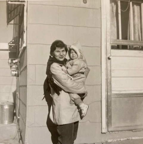A family photo of Lynne & her mother at the side of her childhood home.